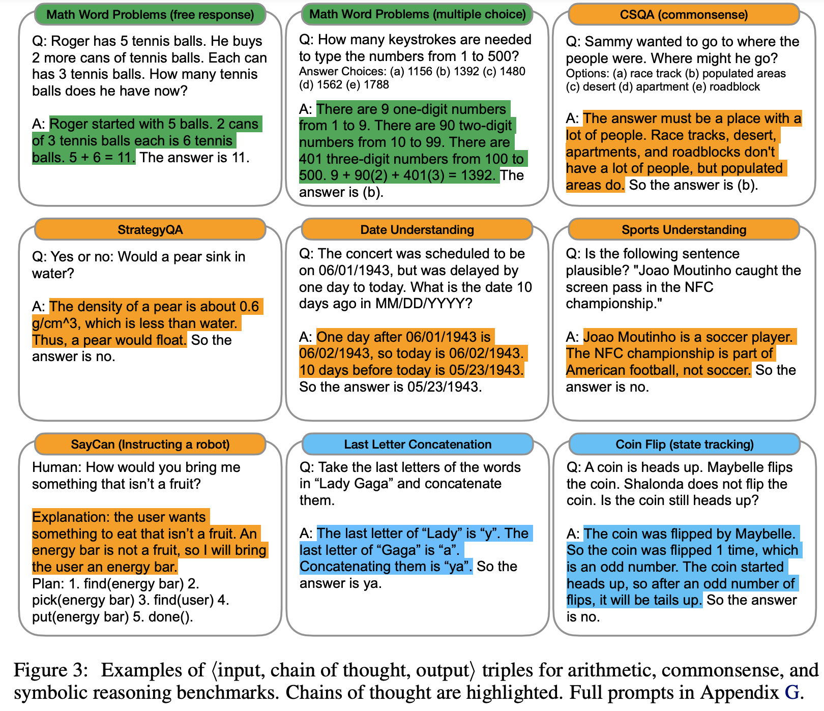 chain of thought:简称Cot,文章链接,https://arxiv.org/pdf/2201.11903.pdf。为了提高LLM的推理能力,将推理步骤的内容喂给模型,下图中高亮的部分就是咱们的chains of thought。