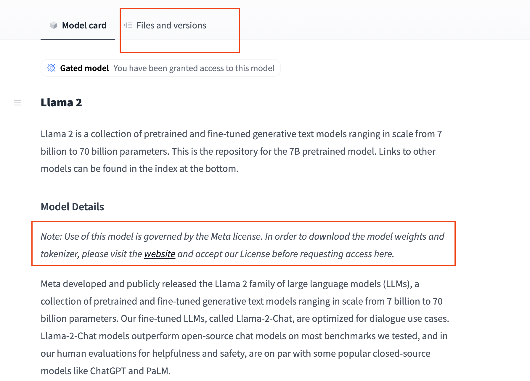 llama模型下载现在需要申请许可,就是点files and version,你要申请一下,然后还要去meta官网(https://llama.meta.com/llama-downloads/)上填写一些信息,然后会给你发个邮件告诉你可以用了。