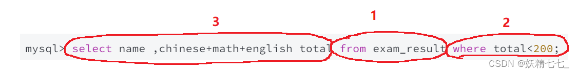 - mysql> select name ,math+english+chinese total from exam_result where english+math+chinese >200 order by total;
