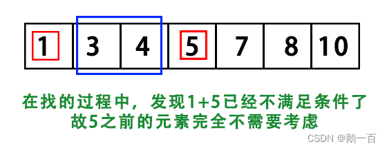 但是,但凡有一点数学功底的人都不难看出,我们可以在找的途中排除掉很多情况。比如,假设我们最开始选出的是1和5,发现1+5=6<9,很明显在5之前的1+3和1+4肯定不满足情况,我们可以直接舍弃掉。
