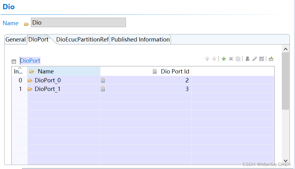 1. 其实Dio并没有什么实质的作用,主要起到了一个重命名的功能。双击DioConfig_0进入下面的界面中,我们先看到图中有一个DioPort_0和它的