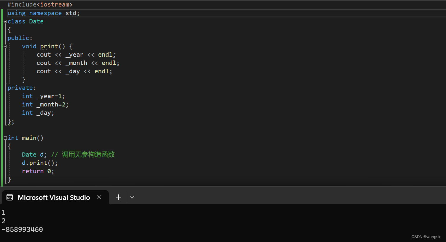 class Date { public: // 1.无参构造函数 //Date() //{ // _year = 1900; // _month = 1; // _day = 1; //} // 2.带参构造函数 Date(int year=1, int month=1, int day=1)//还可以构成函数缺省 { _year = year; _month = month; _day = day; }//两个Date形成函数重载,语法上这两个函数都可以存在但是实际上会出问题“Date::Date”: 对重载数数的调用不明确 //但同时可以发现缺省构造函数可以覆盖无参构造,只有加了缺省才能使用Date d1;d1.print();否则会报错 void print() { cout << _year << endl; cout << _month << endl; cout << _day << endl; } private: int _year; int _month; int _day; }; int main() { Date d1; // 调用无参构造函数 Date d2(2015, 1, 1); // 调用带参的构造函数 Date d2(2015); // 调用带参的构造函数且是函数缺省 // 注意:如果通过无参构造函数创建对象时,对象后面不用跟括号,否则就成了函数声明 // 以下代码的函数:声明了d3函数,该函数无参,返回一个日期类型的对象 // warning C4930: “Date d3(void)”: 未调用原型函数(是否是有意用变量定义的?) //Date d3();//不能这样写,因为这样可能会与函数声明混淆,date为返回类型,d3()为声明 d1.print(); d2.print(); d3.print(); return 0; }