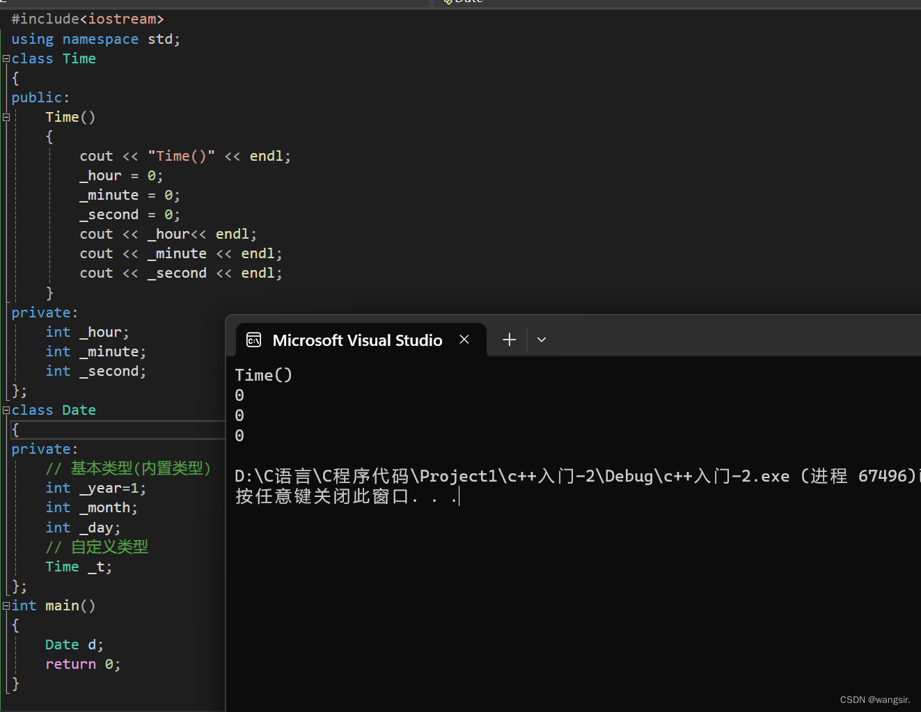 class Time { public: Time() { cout << "Time()" << endl; _hour = 0; _minute = 0; _second = 0; } private: int _hour; int _minute; int _second; }; class Date { private: // 基本类型(内置类型) int _year; int _month; int _day; // 自定义类型 Time _t; }; int main() { Date d; return 0; }