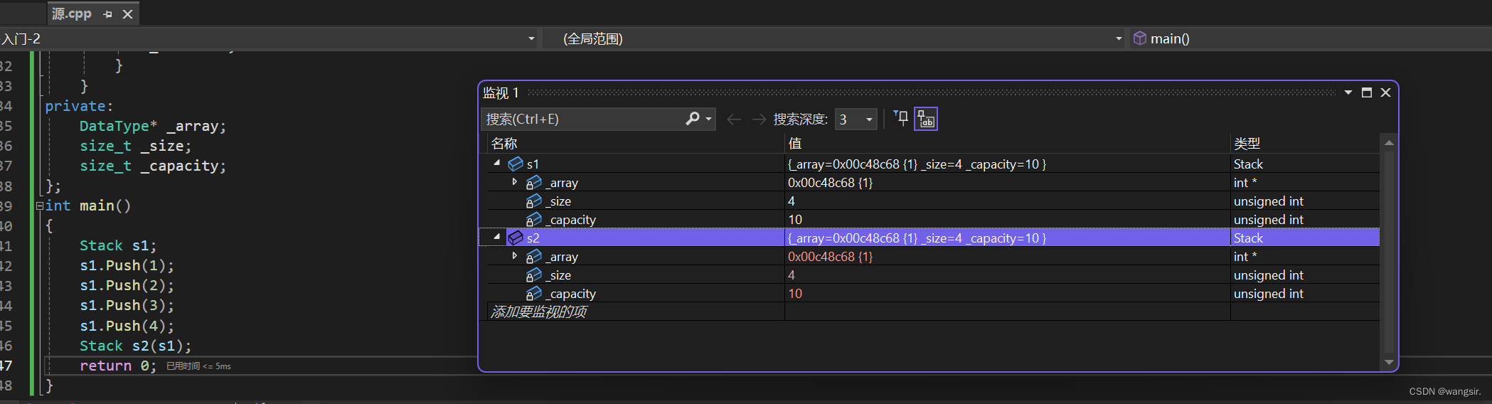 // 这里会发现下面的程序会崩溃掉?这里就需要我们以后讲的深拷贝去解决。 typedef int DataType; class Stack { public: Stack(size_t capacity = 10) { _array = (DataType*)malloc(capacity * sizeof(DataType)); if (nullptr == _array) { perror("malloc申请空间失败"); return; } _size = 0; _capacity = capacity; } void Push(const DataType& data) { // CheckCapacity(); _array[_size] = data; _size++; } ~Stack() { if (_array) { free(_array); _array = nullptr; _capacity = 0; _size = 0; } } private: DataType *_array; size_t _size; size_t _capacity; }; int main() { Stack s1; s1.Push(1); s1.Push(2); s1.Push(3); s1.Push(4); Stack s2(s1); return 0; }