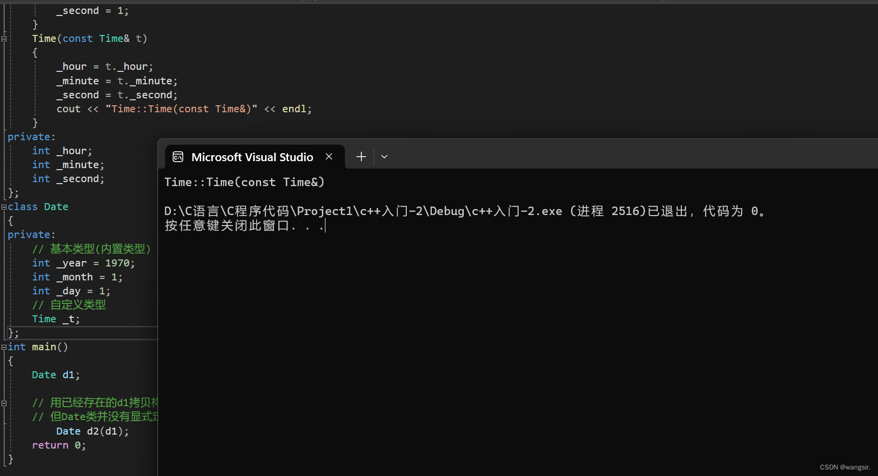 #include<iostream> using namespace std; class Time { public: Time() { _hour = 1; _minute = 1; _second = 1; } Time(const Time& t) { _hour = t._hour; _minute = t._minute; _second = t._second; cout << "Time::Time(const Time&)" << endl; } private: int _hour; int _minute; int _second; }; class Date { private: // 基本类型(内置类型) int _year = 1970; int _month = 1; int _day = 1; // 自定义类型 Time _t; }; int main() { Date d1; // 用已经存在的d1拷贝构造d2,此处会调用Date类的拷贝构造函数 // 但Date类并没有显式定义拷贝构造函数,则编译器会给Date类生成一个默认的拷贝构造函数 Date d2(d1); return 0; }
