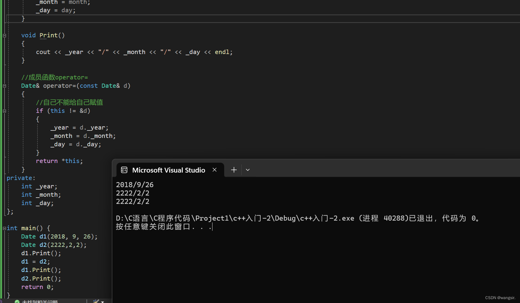 #include<iostream> using namespace std; class Date { public: //全缺省构造函数 Date(int year = 0, int month = 0, int day = 0) { _year = year; _month = month; _day = day; } void Print() { cout << _year << "/" << _month << "/" << _day << endl; } //成员函数operator= Date& operator=(const Date& d) { //自己不能给自己赋值 if (this != &d)//这个&d是取地址,因为this是指针也是地址 { _year = d._year; _month = d._month; _day = d._day; } return *this;//*this就是d1 } private: int _year; int _month; int _day; }; int main() { Date d1(2018, 9, 26); Date d2(2222,2,2); d1.Print(); d1 = d2;//已经存在的对象,一个拷贝赋值给另一个,d2给d1 d1.Print(); d2.Print(); return 0; }