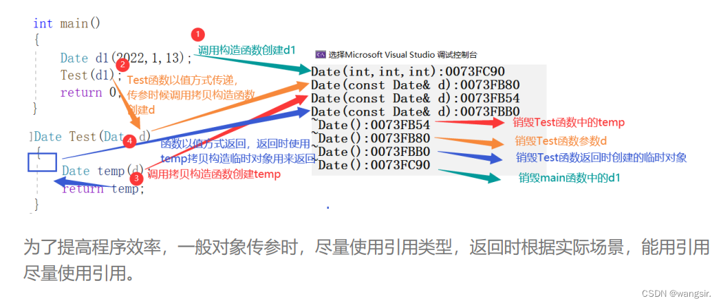 class Date { public: Date(int year, int minute, int day) { cout << "Date(int,int,int):" << this << endl; } Date(const Date& d) { cout << "Date(const Date& d):" << this << endl; } ~Date() { cout << "~Date():" << this << endl; } private: int _year; int _month; int _day; }; Date Test(Date d) { Date temp(d); return temp; } int main() { Date d1(2022,1,13); Test(d1); return 0; }