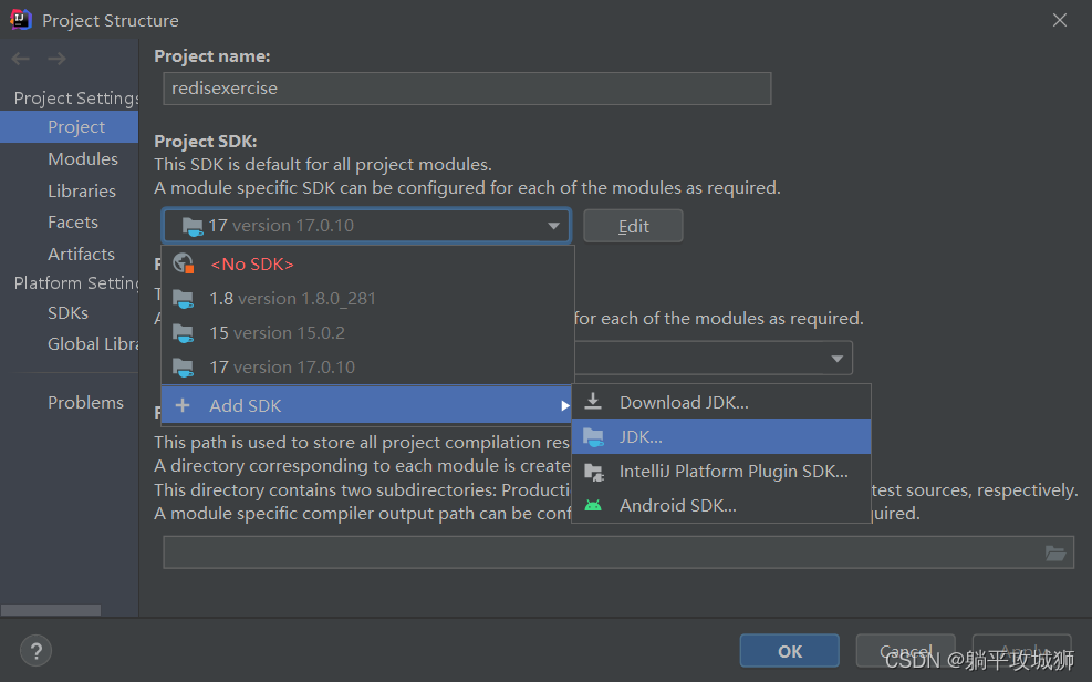 下载好后解压缩到自己想要放置的目录里,然后就可以在idea中导入了,如下图中Project Structure - Project - Add SDK - JDK 就可以选择我们刚刚下载好的JDK17了,这时候就成功导入啦,看图上可选版本多了一个17