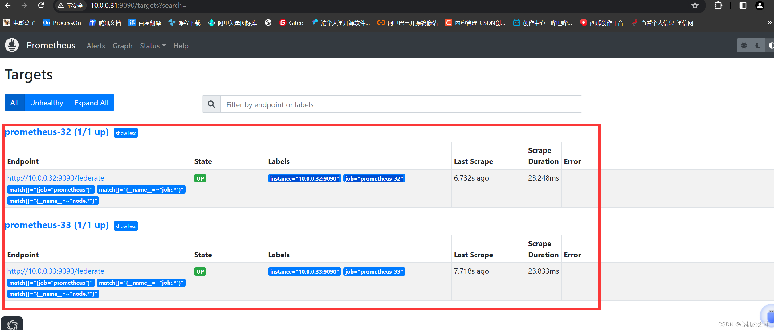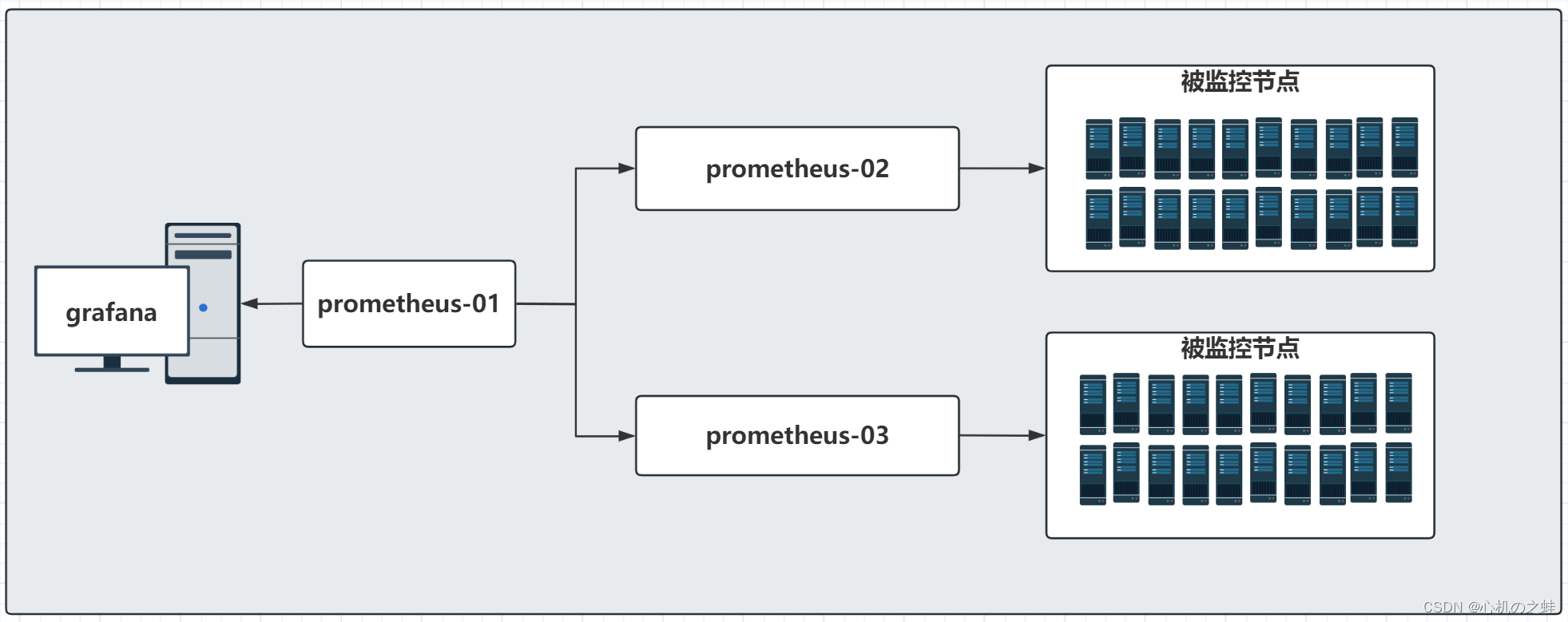 由于,在大型企业中,被监控项目比较多,多到一台prometheus服务无法承载其大量的监控数据的传输,所以,联邦模式应运而生,它同等于zabbix监控的分布式,就是将大量的被监控项,分开进行监控,然后再汇总到一台prometheus的服务上。