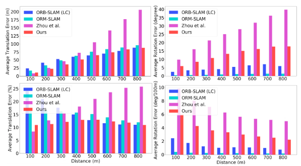 可以清楚地看到,当平移幅度较小时,本文的方法优于ORBSLAM。随着平移幅度的增加,帧到帧 VO 的简单集成开始逐渐漂移,这表明基于地图的跟踪相对于没有捆绑调整的帧到帧 VO 具有明显的优势