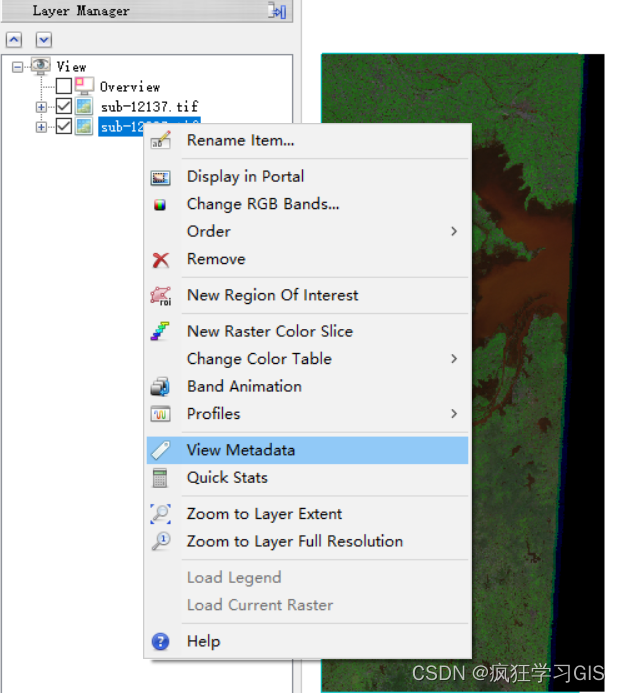 明确了具体需求,接下来就可以开始操作。首先,我们在ENVI软件中打开对应的两景遥感影像;其次,在需要添加地理参考信息的图像名称处右键,选择“View Metadata”。