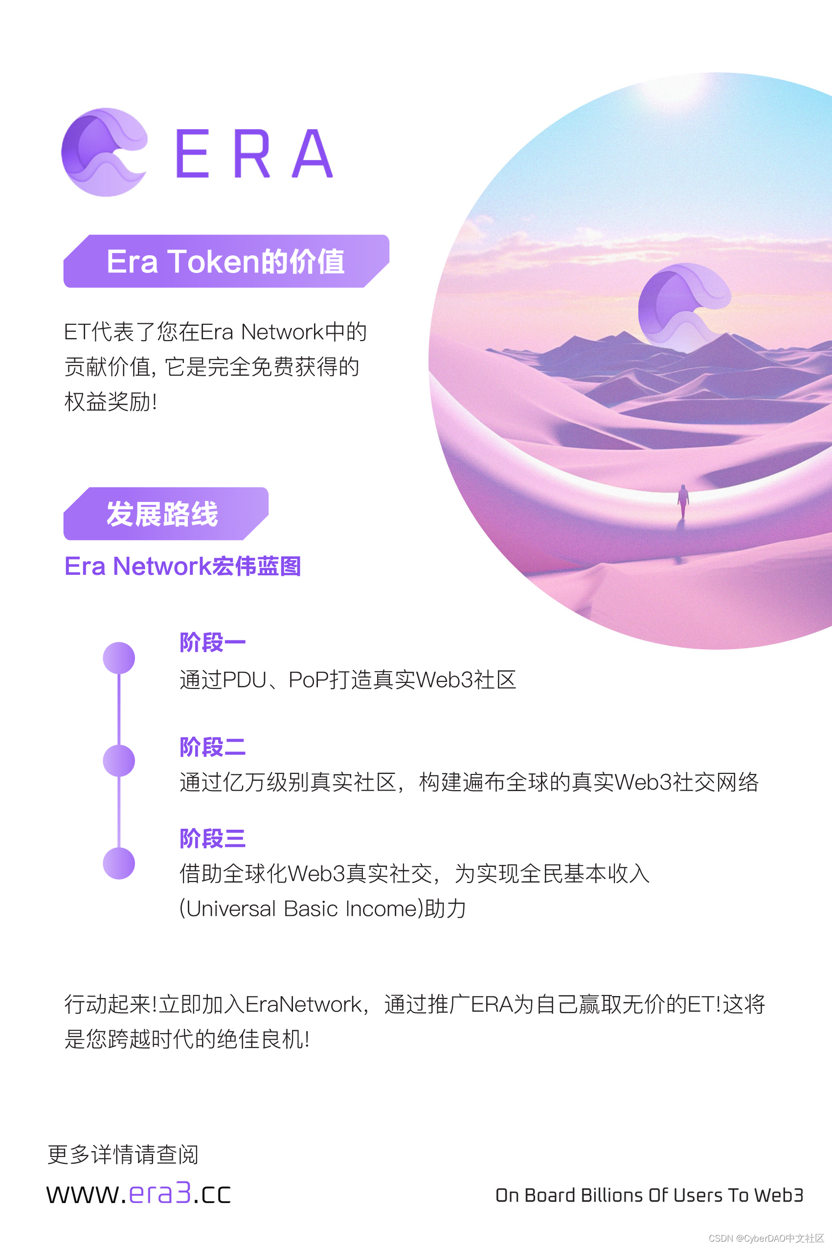 除此之外,用户除了可获得ET积分,还能够在平台上获取源源不断的优质项目空投奖励。这意味Era Network将为Web3世界带来海量的真实用户,杜绝过去行业所面临的女巫攻击,真正发挥Web3企业的代币激励作用,为参与贡献的用户带来正向的价值回报。越多用户参与,越多项目入驻,越多空投,ET价值越高,越赋能行业。目前阶段做好分享获得更多用户、扩大好友网络、成为大使。