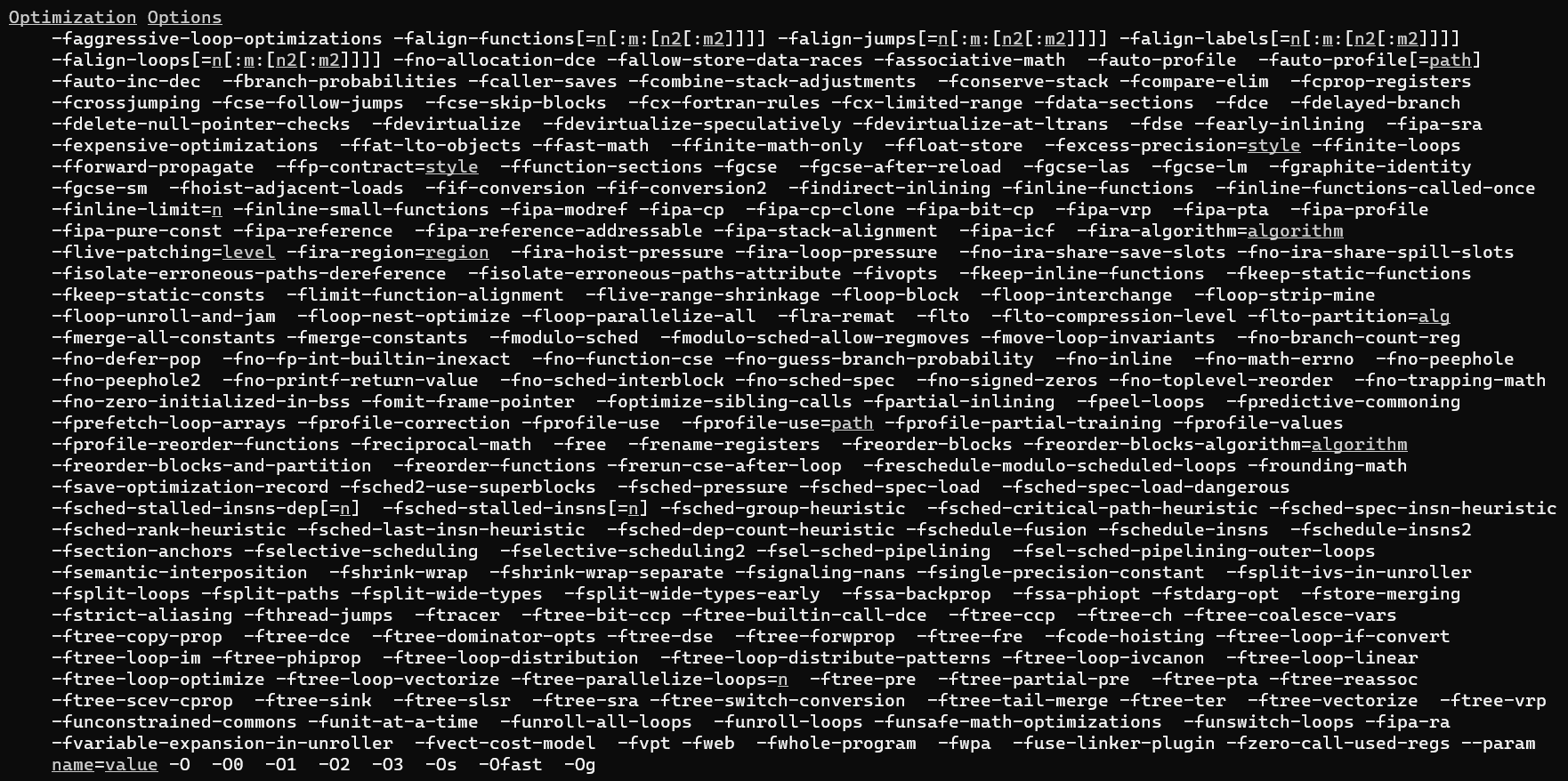 name=value -O -O0 -O1 -O2 -O3 -Os -Ofast -Og