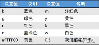 (2)使用颜色的名称:如 'red', 'green', 'blue', 'yellow', 'cyan', 'magenta', 'black', 'white' 等。