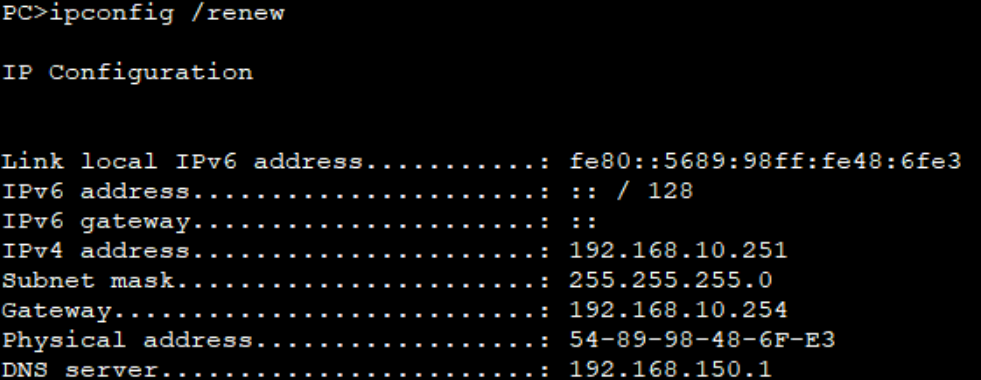 在接入层A-SW1上先不配置DHCP Snooping策略,然后在DHCP-Fake设备上配置好IP地址池并启用。接着在PC1上使用ipconfig /release与ipconfig /renew命令,将之前正常获取到的IP地址进行释放并重新获取,如图所示,PC1从非授权的DHCP-Fake上获取了IP地址等网络参数