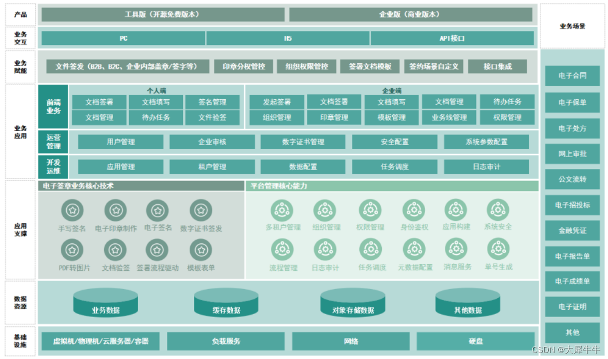 为企业或机构在业务层面提供电子签章完整服务能力。支持私有化部署、多租户、SaaS 化等多种服务模式,提供个人和企业用户注册、实名,组织管理,权限管理,数字证书下发,印章管理,签名管理,电子文件的发起、接收、签署,签署场景支持企业内部文件签批流转、B2B电子合同签署和 B2C 电子合同签署等业务场景。