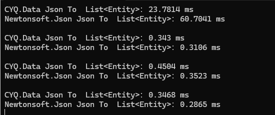 1、在首次执行时,CYQ.Data 全面超过了 Newtonsoft.Json,差距明显,说明 Newtonsoft.Json 首次执行,性能较低,在预热这一块没有优化好。
