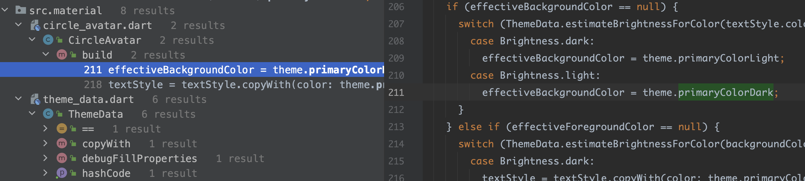 那么就开始往上查找,然后依次返现, FAB 内部是通过 RawMaterialButton 实现的点击,而 RawMaterialButton 内部就有一个 IconTheme.merge 的实现,那么 FAB 里的 Icon 默认应该是使用了 effectiveTextColor 这个颜色。