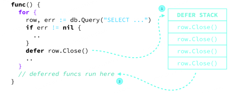 1)直接在每次循环完成后,去掉 defer 关键字,直接执行 row.Close():