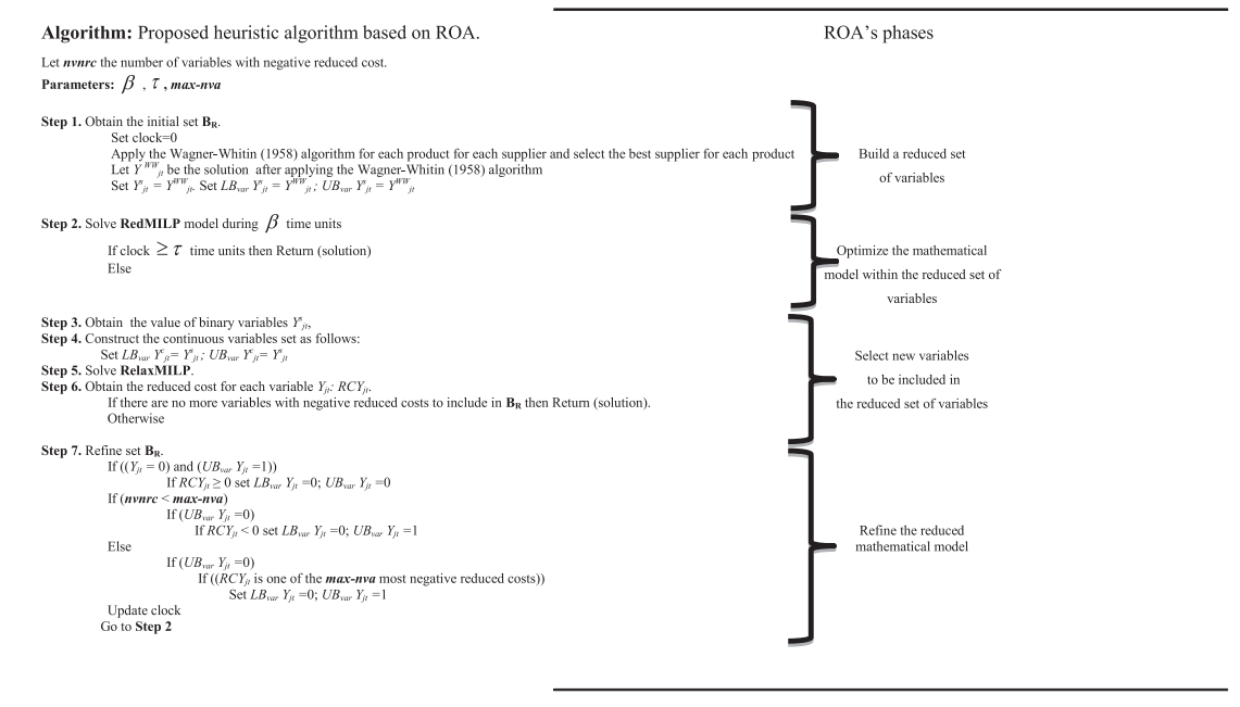 值得一提的是,存在几种流行的算法,用于解决类似于多产品多周期库存批量与供应商选择问题的问题。其中一些是基于遗传算法(GA)、粒子群优化(PSO)、蚁群优化(ACO)、分散搜索(SS)、差分进化(DE)等。这些算法有一组候选解,并且它们迭代地改进解的集合。相反,减少和优化方法(ROA)总是考虑一个小的二进制变量集,并在这个集上优化问题。这是其他流行算法(GA、PSO、ACO、SS、DE)和ROA的主要区别。
