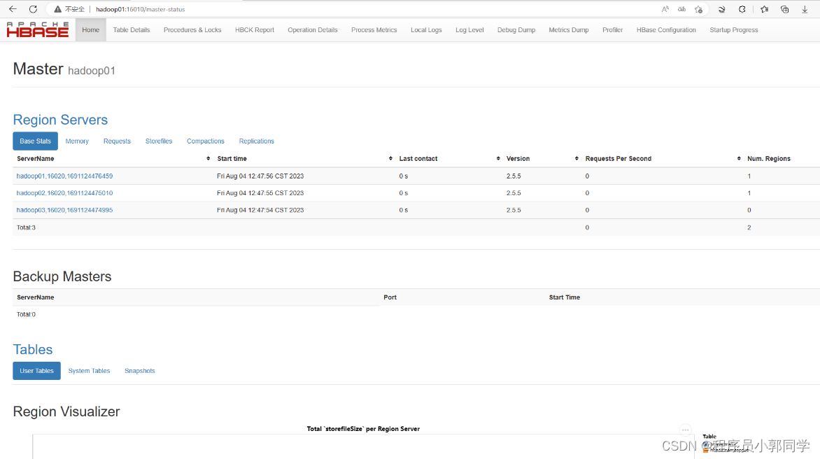 启动成功之后,可以在浏览器中通过http://IP或者主机名:16010来访问HBase的web页面了。