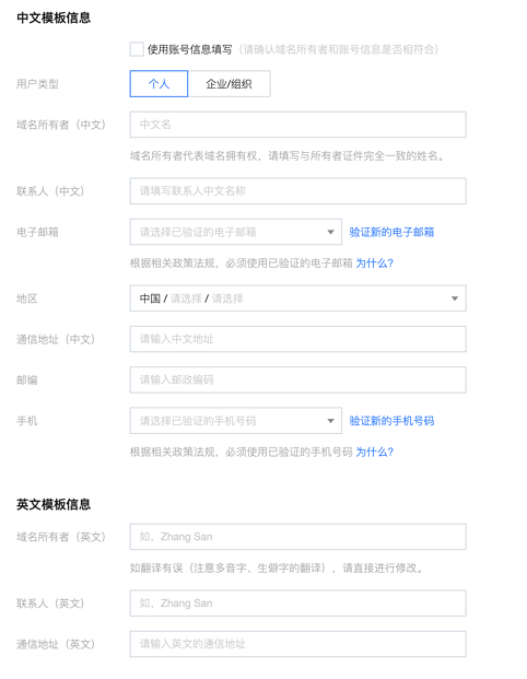 或者 通过链接登录 - 腾讯云,进入 【域名注册首页】> 【信息模板】> 新建模板 ,提交域名认证信息。