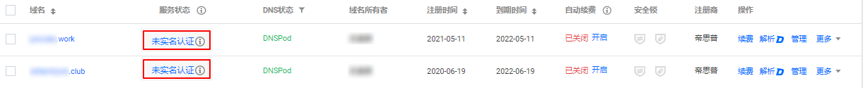 域名服务状态为未实名认证,说明您的域名还未进行认证,需要进行实名认证。点击下图的【未实名认证】标签