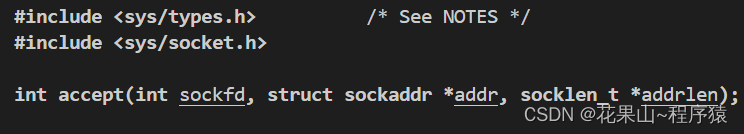 功能:accept()函数会在sockfd套接字上接受一个传入的连接请求(阻塞式接收),并返回一个新的套接字描述符,用于和客户端进行通信。同时,addr和addrlen参数会被填充上客户端的地址信息。
