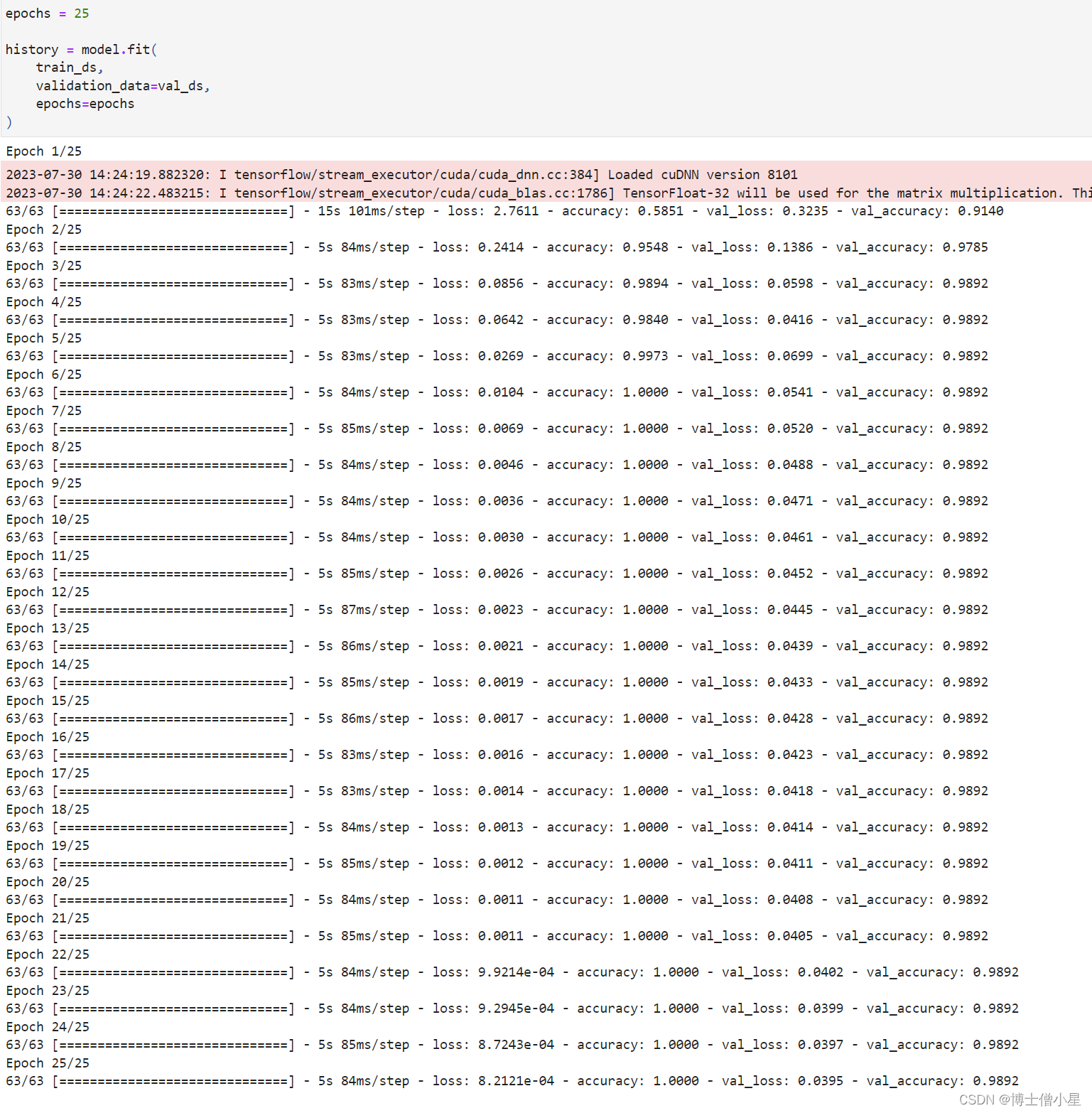 然后开始对模型进行迭代训练,在本项目中指定了25轮迭代次数,其训练过程如下图所示。
