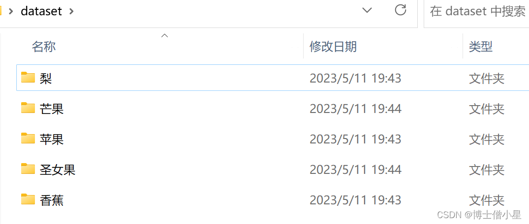 在本文中为了演示如何实现一个图像识别分类系统,通过选取了5种常见的水果数据集,其文件夹结构如下图所示: