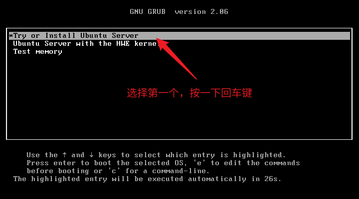 2. 进入安装界面,选择第一个Try or Install Ubuntu Server,然后按一下回车/: