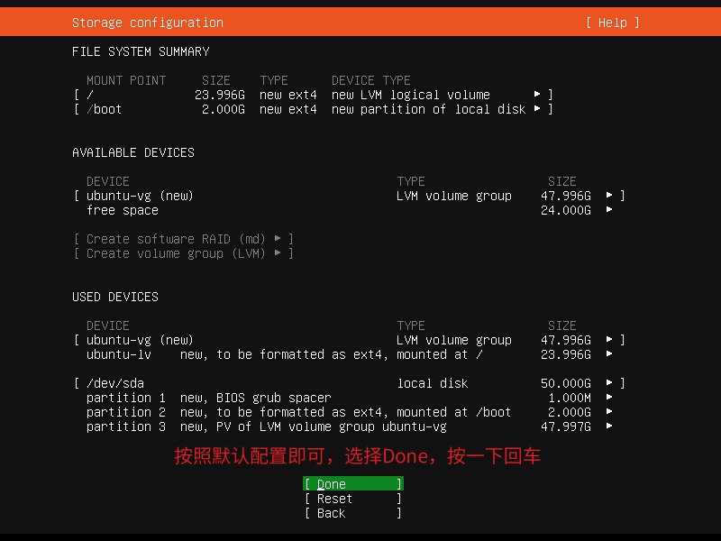 12. 存储大小配置,按照默认配置即可,选择Done,按一下回车: