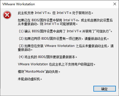 1. 开启刚刚创建好的虚拟机,此时VMware会弹出一个错误信息: