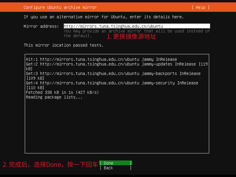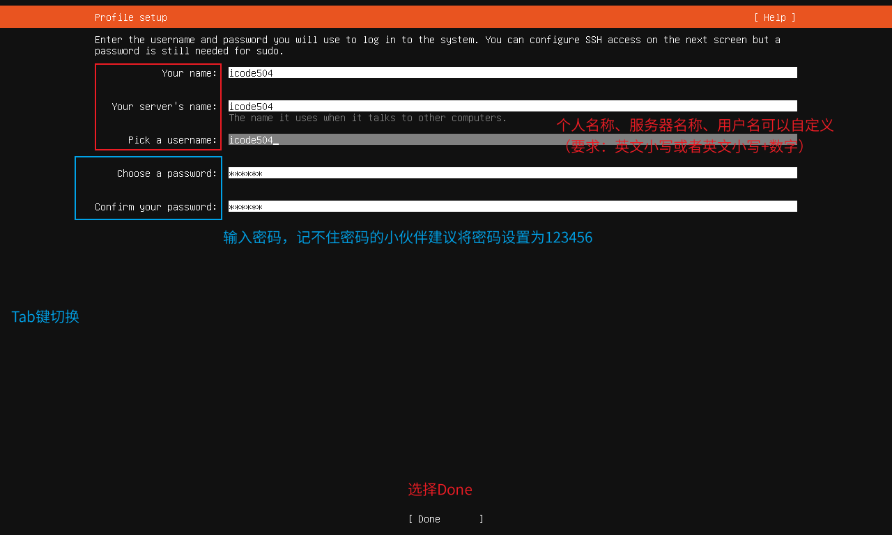 14. 配置用户名和密码,如下图所示,完成后选择Done,按一下回车: