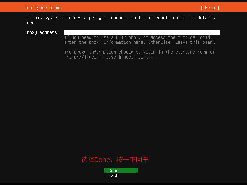 9. 这里我们不需要配置代理。选择Done,按一下回车: