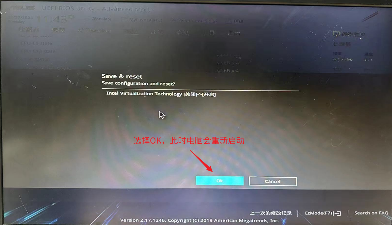 4. 按照下图所示操作,点击高级,将Intel Virtualization Technology配置项开启: