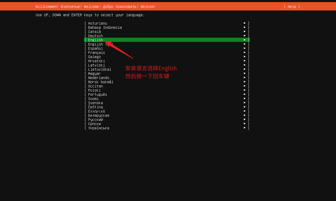 4. 加载完成后 ,进入Ubuntu安装界面,安装语言选择English,完成后按一下回车: