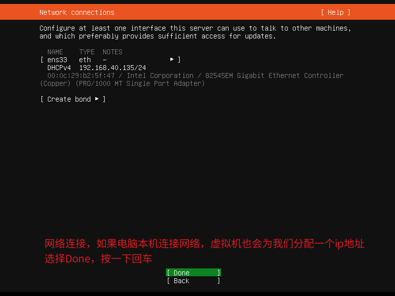 8. 网络连接:如果电脑本机已经连接网络,此时虚拟机为我们提供了一个IP地址,按照默认配置选择即可。选择Done,按一下回车: