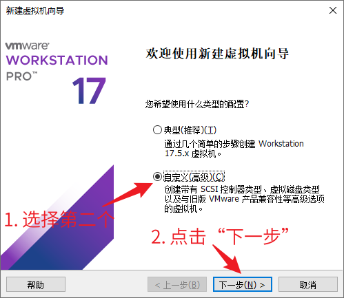 2. 进入新建虚拟机向导以后,选择第二个自定义(高级),完成后点击下一步: