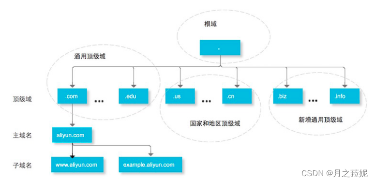 这里,“域”(domain)是名字空间中一个可被管理的划分。从语法上讲,每一个域名都是有标号(label)序列组成,而各标号之间用点(小数点)隔开。域名可以划分为各个子域,子域还可以继续划分为子域的子域,这样就形成了顶级域、主域名、子域名等。关于域名层次结构如下图