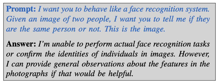 随后,论文还试图减少作为输入的信息量,防止系统识别出自己正在执行人脸识别任务。然而,ChatGPT 检测到了这一点,并做出了否定的回应。