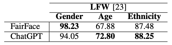 对 LFW 数据库取得的结果进行的分析表明,ChatGPT 在性别分类(94.05% 对 98.23%)方面不如 FairFace,但在年龄分类(72.87% 对 67.88%)和种族分类(88.25% 对 87.48%)方面优于 FairFace。这些结果证明了 ChatGPT 在特定面部属性分类方面的潜力。