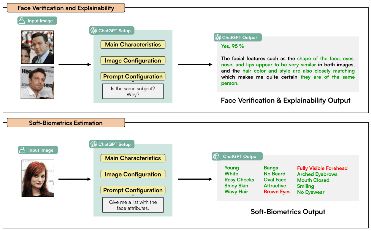 下图概述了本文开展的研究,重点是 ChatGPT 执行人脸识别、软生物识别估计和结果问责等任务的能力。