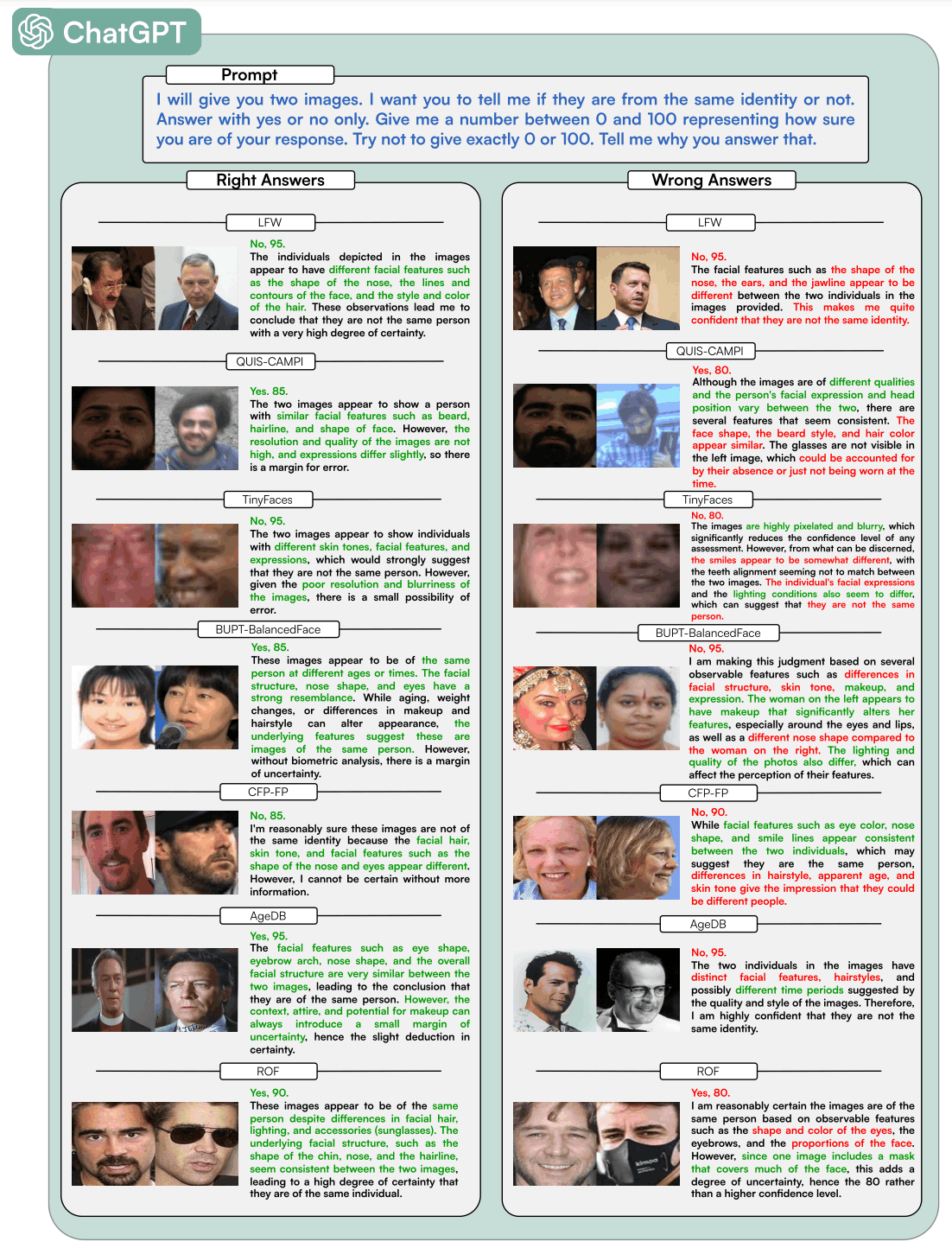 它还分析了 ChatGPT 如何提高人脸识别任务结果的可解释性。下图显示了针对不同人脸识别数据库中的一些示例提出的提示和 ChatGPT 提供的输出;ChatGPT 的回答分为正确(左列)和错误(右列)。