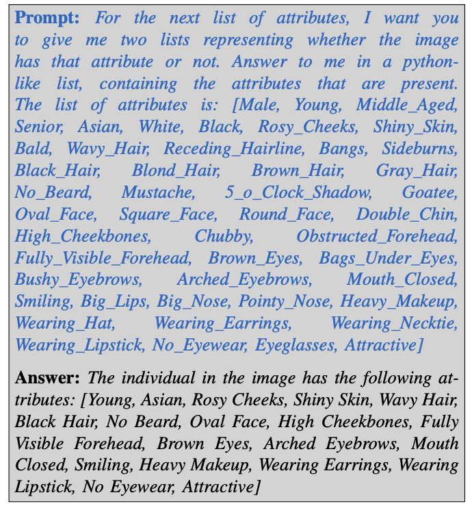 为了定量评估 ChatGPT 的性能,我们提出了包括流行的 MAADFace 数据库中考虑的面部属性的提示。这样就能与最先进的方法进行直接比较。接下来,我们将提供一个建议的提示来评估 ChatGPT 估算面部软生物识别的能力。
