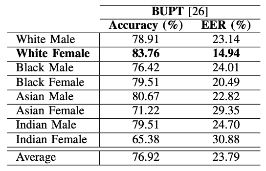 在处理种族偏见、姿势、年龄和屏蔽等问题的数据库中也发现了类似的不良表现。这也揭示了 ChatGPT 在不同人口群体之间存在明显的偏差。例如,从下表可以看出,在 BUPT 数据库评估中,不同种族和性别的表现非常不同,白人女性群体的 EER 为 14.94%,而印度女性群体的 EER 为 30.88%。