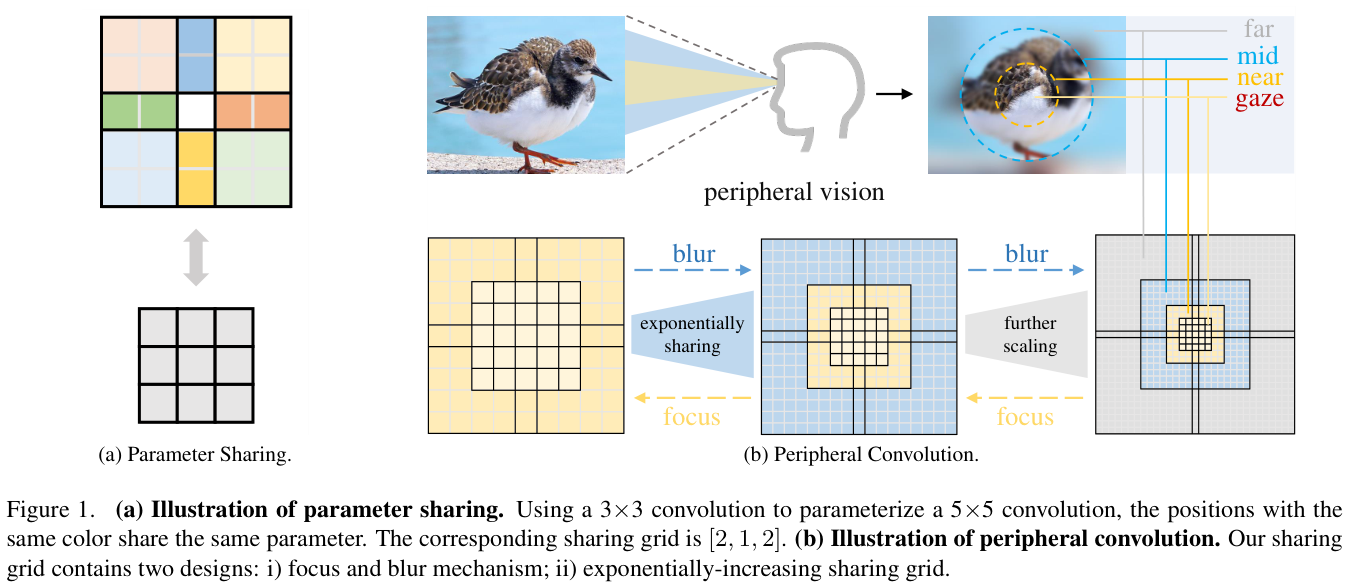 受人类视觉的启发,论文提出一种新颖的外围卷积,将卷积的参数复杂度从 O ( K 2 ) O(K^{2}) O(K2) 降低到 O ( l o g K ) O(\mathrm{log} K) O(logK),同时保持密集的计算形式。外围卷积由三种设计组成: