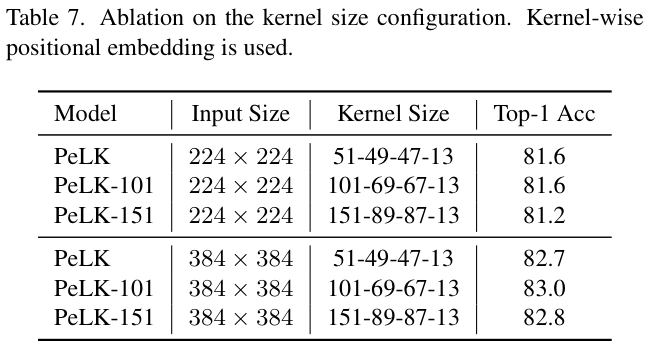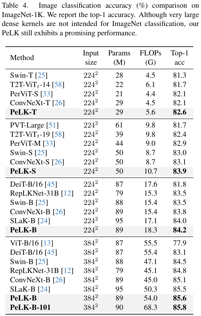 101×101),并具有持续的改进。PeLK在各种视觉任务中实现了最先进的性能,在配备极大的内核尺寸时展示了纯CNN架构的潜力。