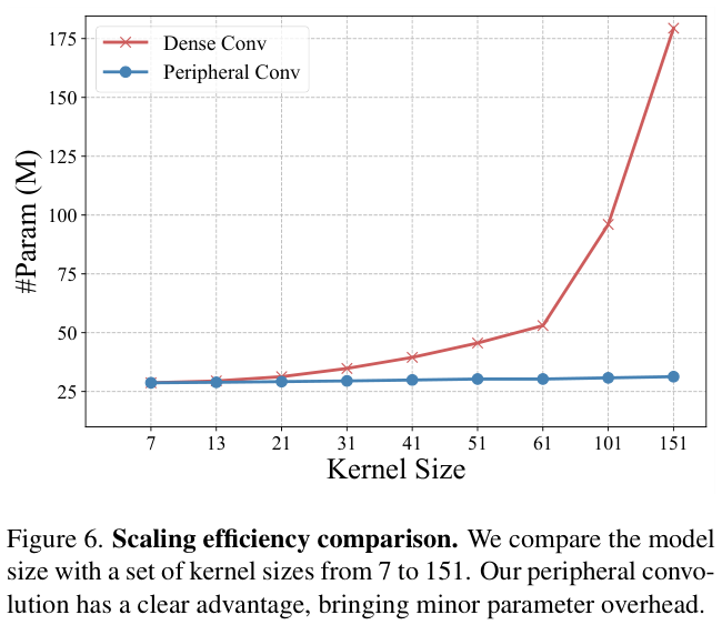 基于外围卷积,论文提出了参数高效的纯CNN大型内核网络(PeLK),其有效感受野(ERF)与参数量呈指数增长。在精心设计的参数共享机制的帮助下,PeLK以非常小的参数成本扩展了内核大小,实现了极大的密集内核(例如