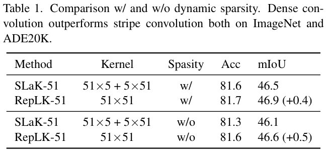 5×5 卷积来缓解优化问题。表 1 的结果表明,无论动态稀疏性如何,密集网格卷积都超过了条带卷积。